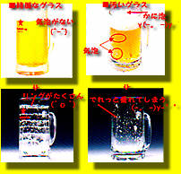 @スポンジと、中性洗剤をご用意下さい。 ★綺麗なグラスにビールを注ぐとグラスの表面には気泡ができません。 ★綺麗なグラスで飲むと、ご覧のようにリングが生まれます。 |