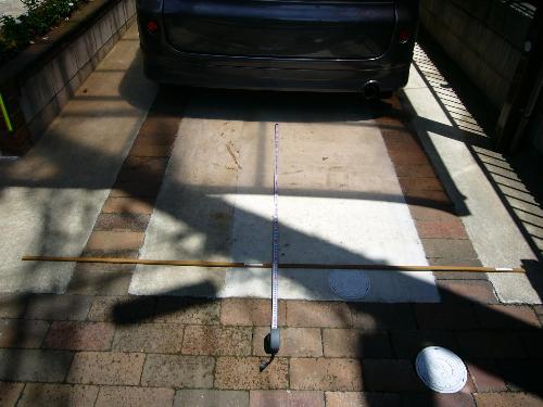 早速再設定の準備です。 車両後方のバンパーの一番後方から、1120ミリの位置の中央部分ににモール(棒)を置きます。