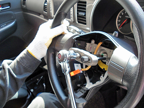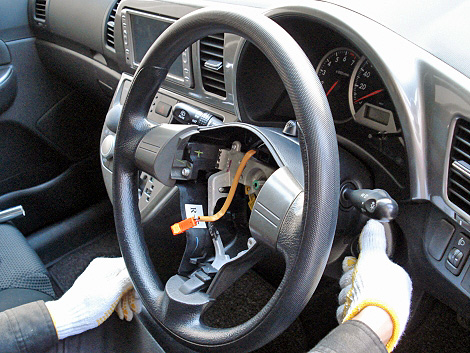 ウィッシュのステアリングの取外しです。一般的な自動車のステアリングの取外し方法で取外すことができます。