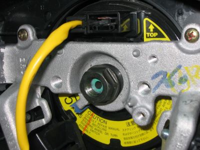 エアーバッグユニットを取外したら、後はステアリングホイールの取外しです。まずセンターのボルトを取り外します。