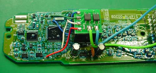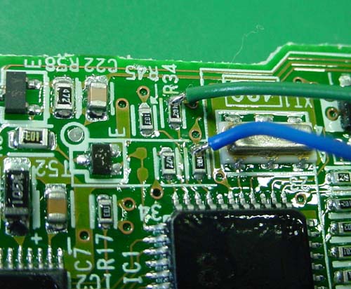 細い緑線と青線を半田付けします。
