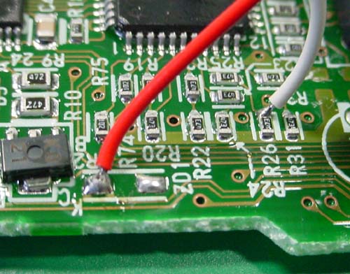 細い赤線と白線も半田付けします。