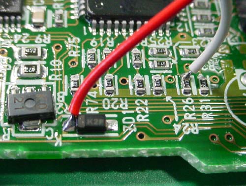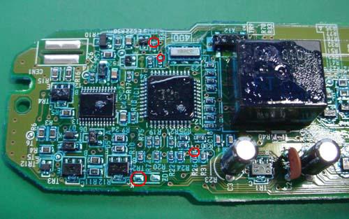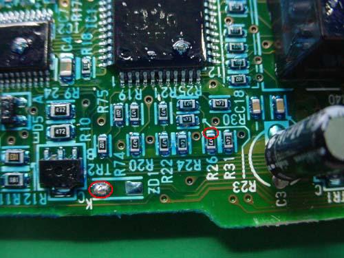 赤線の接続先には、黒い部品(ツェナーダイオード)が搭載されている場合もあります。