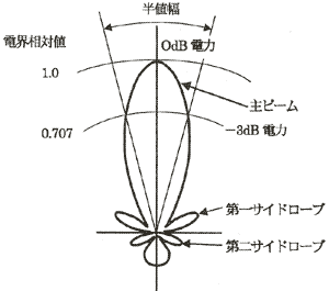 パラボラアンテナの指向性を図3・13に示す。放射電力が最大値の半分となる放射ビームの幅をアンテナの半値指向幅θ-3dBとする。電力が半分の値はデシベル表示で最大値より-3dB電力が低くなる指向幅である。電界では-6dB(0.707)となる。