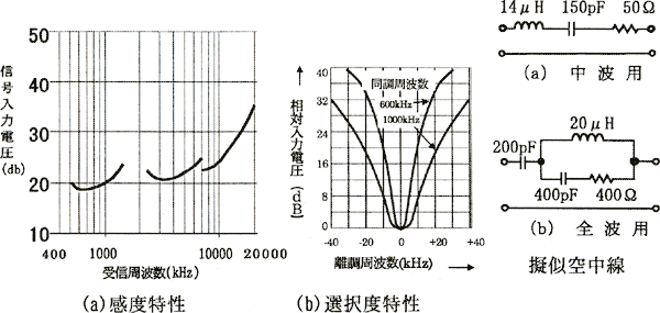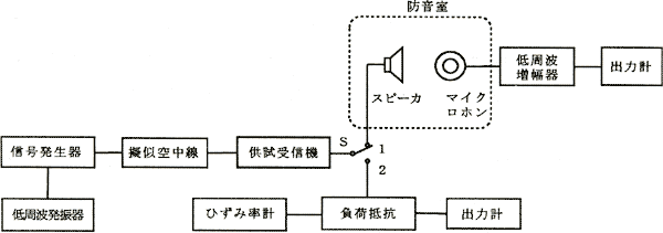 ![]() 信号発生器出力を擬似空中線回路を通して受信機に入力する。擬似空中線回路はアンテナと同じインピーダンス(高周波抵抗)を持つ回路で,アンテナを接続したときと同じ状態とするためである。出力スイッチSを1にするときは音声出力がマイクロホンで検出されて音質(忠実度)が測定される。