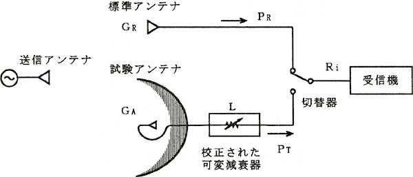 ![]() 送信アンテナから一定の電力を送信する。まず標準アンテナで受信したときの電力をPRとする。次に試験アンテナに切り替えて受信する。この時の受信電力PTが