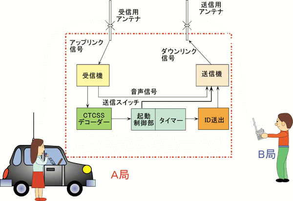 「CTCSSデコーダー」はA局が送信してきたアップリンク信号に88.5Hzのトーン信号が含まれているか否かの検出回路で,もし88.5Hzの信号が含まれている場合,起動制御部に送信機をONにする指令を出して,アップリンク受信機が受信した音声をダウンリンク周波数に中継送信します。B局はダウンリンクの周波数を受信することで,A局の送信した音声を聞くことができるのです。