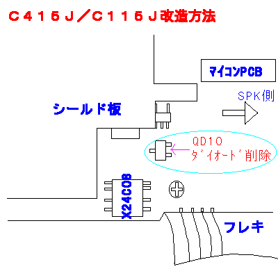 改造ポイントはロジック基盤の下記図のチップ部品 QD10をハンダゴテで、削除するだけです。
