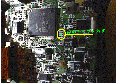 緑色のチップ部品をハンダゴテで、はずすだけです。