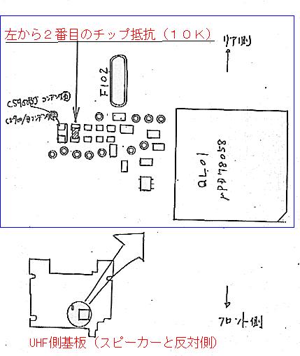 C−5900拡張方法 拡張後の受信周波数範囲 108〜135.995MHz AM 136〜190.000MHz FM 300〜399.995MHz AM/FM 400〜480.000MHz FM 800〜999.995MHz FM 改造ポイントはロジック基盤の下記図のチップ部品 ハンダゴテで、削除するだけです。 ★注意 ハンダゴテでの作業は慎重に!! 部品を取り外した後、リセットを忘れずに !! リセットはオールリセット [F]を押しながら電源を入れる。 以上で終了です バック