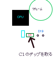 改造ポイントは、全面パネルの裏側CPUがついている基板です。 全面パネルの裏基板にCPUのすぐ下に C1と書かれたチップ部品が有ります。 これをハンダゴテで、削除してください。 これで、ハード改造は終わりです。 ただし、ハード改造後にコマンド入力が 必要です。 |