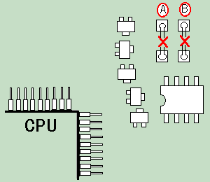 IC−μ3拡張方法 拡張後の受信周波数範囲 425〜447.000MHz FM 改造ポイントは基盤下記図のジャンパー線(A)をカットで受信改造・ ジャンパー線(B)で、5KHzステップ改造 ★注意 基板を起こすときは慎重に!! 以上で終了です バック