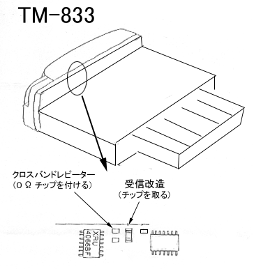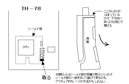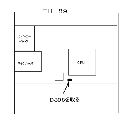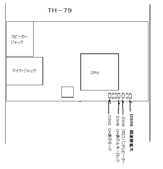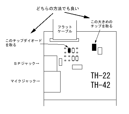 | TH−22 | 136〜174MHz | つまみを引き抜き、上部カバー(ゴム)を外し、 ケースのネジ2本を外して、図のチップダイオード を取る |