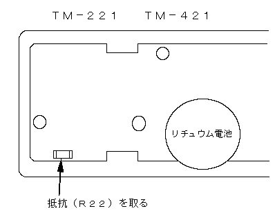 | TM−221 | 140〜160MHz | リチュウム電池のある基板の図のR22を取る。 改造後の表示周波数幅よりも実際のVCOロック 周波数幅は狭い。 |