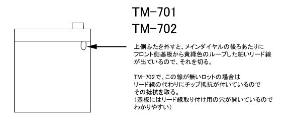 | TM−421 | 430〜450MHz | リチュウム電池のある基板の図のR22を取る。 改造後の表示周波数幅よりも実際のVCOロック 周波数幅は狭い。 |