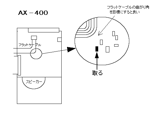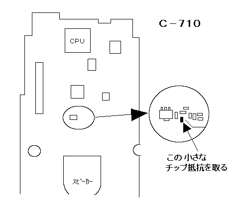 図の小さなチップ抵抗を取る。(取りにくいです) 本体を開くときにはケーブルを切らないように 注意。組立後のリセットは不要 |