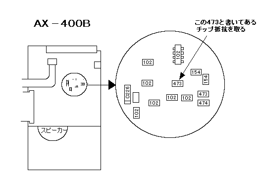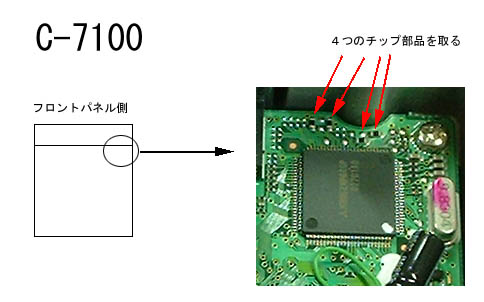 スピーカー面のフタを外して、フロント近くの 図の4つのチップ部品を外す。 |