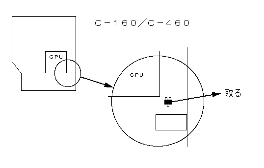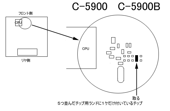本体カバーを外し、図を参照してCPUの横の方に 5つ並んだチップ用ランドに1つだけ付いている部品 を取る |