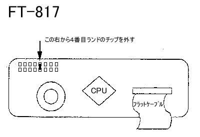 FT-817 受信拡張1.ネジを全て外して、上下のケースを外す。 上ケースを外す場合、SPのコネクタも外す。 スピーカーの反対側の電池ケースのロックネジも外す。 (バネが飛び出るので注意) 2.フロントパネルを外す。 表面、裏面のツメを上手く外し、フロントパネルを前に引き出す。 (フラットケーブルに注意) ![]() ![]() 3.フロントパネル裏側の、エンコーダー部分の 上にあるランドのチップを外す。 4.完了後、元どおりに組み立ててから [F]と[V/M]を押しながら電源を投入する。 拡張御後のバンド 0.1〜33MHz 33〜56MHz 76〜108MHz 108〜137MHz 137〜154MHz 420〜470MHz (有)無線屋 |