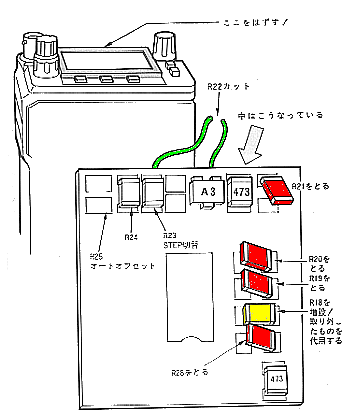 TH−25拡張方法 拡張後の受信周波数範囲 ☆VHFバンド 140MHz〜159.00MHz FM (表示) 上記の表示が出るが、PLLのロックがバンドエッジははずれる 受信改造は1つのチップ部品をはずすだけ!! 改造箇所は、無線機本体のケースをはずして、 緑色のチップ部品をハンダゴテで、はずすだけです。 基板を外すときは、フラットケーブルを切らないように細心の注意を払って下さい。 下記の図を参考にして下さい。 以上で、完了です。 バック