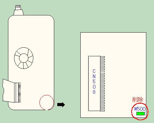 改造ポイントは基盤の下記図のチップ部品 R505(W500)をハンダゴテで、削除するだけです。