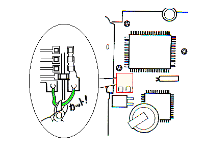 改造ポイントはロジック基盤の下記図の緑色のループ線をカットするだけです。