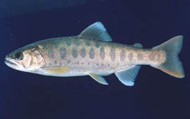 全長サクラマス60cm、ヤマメ30cm ヤマメは、サケの仲間で、ふ化後、オスの多くは、そのまま一生川に残っているんだ。メスの多くは海に下り1年間回遊しながら海で生活するんだよ。海に降(お)りたものは「サクラマス」とよばれるんだ。サクラマスは、川と海の両方に住み、ヤマメは、川だけで生活しているんだ。サクラマスの多くはメスでヤマメの多くはオスなんだよ。不思議な魚だね。 上流に住む |