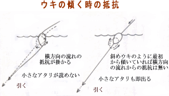手前に引かれ潮スジを離れる 3. 風が流れと同じ方向、左に吹いている場合も同じ状況になり易い 4. 道糸を張るとウキは段々と手前に来る 5.