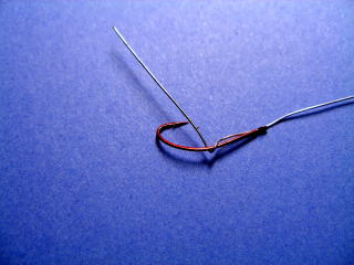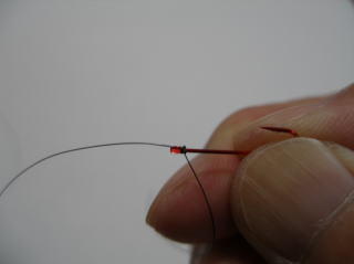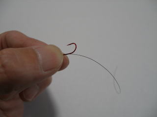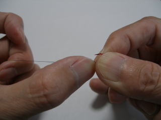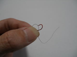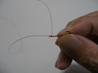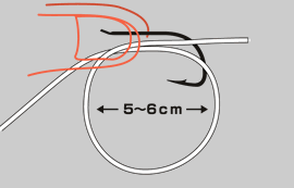![]() 針先を上にして針とハリスを押さえます ハリスは押さえた位置から15cm程取ります |