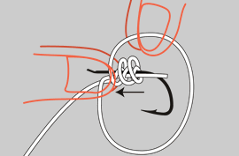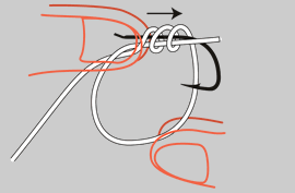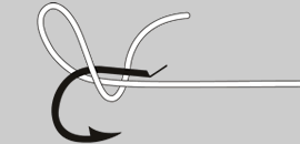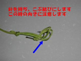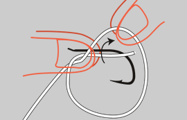 外掛け結びで気をつけておきたいことは、一番最後わっかに余り糸を入れるときです。必ず巻きあげてきた方向から糸を入れるようにして下さい。本やホームページでも間違っている図をよく見ます。反対でも締まりますが強度が低下します。