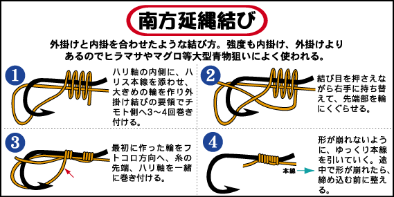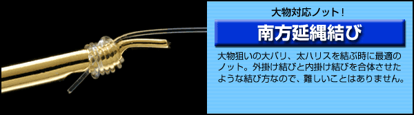 南方延縄結びをした後、ハリスをカンに入れるだけの簡単なノットです。ハリスをカッとする時、ハリスの結びシロへの考慮をお忘れなく。