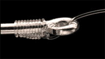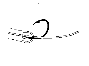 この補助具を利用すると、ループは「補助具」で支えられ、ラインを両手で操作できますので(ラインの先端を「歯」で保持する事も可能)、立ち込み中でも、ヨリの強い「ビミニ・ツイスト」を作ることが出来ます。 多少の強度低下には目をつむって、簡単な「スパイダー・ヒッチ」や「サージャン・ノット」でしのぐのも1法ですが、急いで不精をした時ほど、大物が掛かるものです。 |