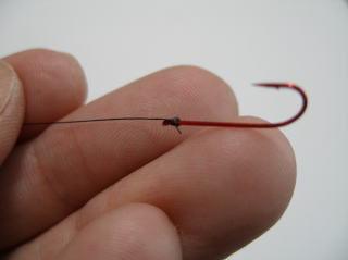 エダスや予備ハリスを何本も結ぶ時には、簡単なので早く結べる・結び目からでるハリスが、針軸に対し曲がり気味だが(針軸と平行ではないが)強度は十分。