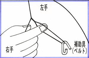 ![]() 向こう側から針と輪を包むように通します 右手の薬指、小指で後を支えて抜きます |
