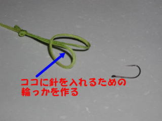 ハリスでハリ側に大きめの輪を作り、ハリの軸を挟む。ハリスの先端を斜めにカットしておく。