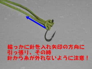 ![]() まだきつく締めないでちもとまで移動します ハリスがちもとの上を通るようにします |