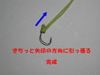 結び目を回転させて、ハリスがハリ先の反対側にくるように整える。ハリスの先端をカンにくぐらせ、ゆっくり引き締めて完成。