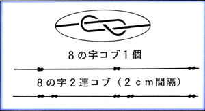 | ● | また、『8の字コブ』の位置を上手に決めておくと、釣りの最中でも、使用中の針を動かして、針と針の間の間隔を変えることができます。 |