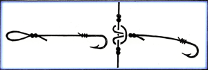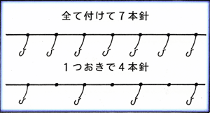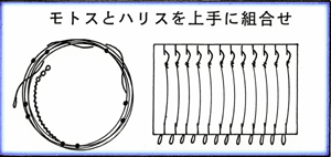 | ● | 標準とする針数分の『8の字コブ』より1〜2個多めの『8の字コブ』をあらかじめモトスに作っておくと、いざと言う時、同じ仕掛けに1〜2本の針をすぐに増やすことができます。 |
