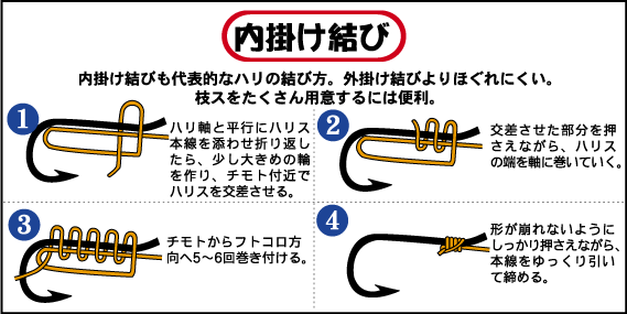 特に覚えなくてもいいようですが、ハリスが短いとき(枝ハリス)や孫鈎仕掛けのときなどは、結べるようになっておくとやはり助かります。