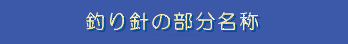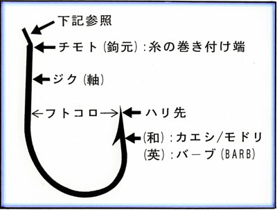 釣り針の部分名称は、昔から各地で色々な呼び方が有った為か、釣り専門誌でも、針専門メーカーさんでも統一されておりませんが、弊社で調べた結果、下記のような名称が一般的と考えられますので、ご参考までにまとめてみました。 尚、「針(ハリ)」の字は「鉤(カギ)」「鈎(カギ)」を当てる事があります。ちなみに、「鉤針」は「カギバリ」と読みます・・・漢字は難しいですネ! |