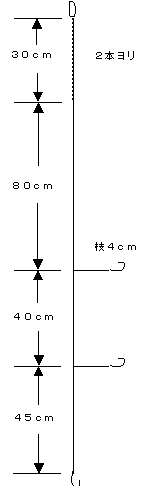 ・仕掛けの寸法は「がまかつ」の「欲ばりキス」の3本針仕掛けを参考にしています。 ・キスは居る所に投げてサビけば結構釣れる魚ですので、あまり仕掛けにこだわっていませんが、 仕掛けの全長は長い方が良さそうな気がしています。 ・針は競技用キスの8から10号です。 えさは一口サイズに切って付けます。