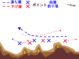 夏・秋チヌ釣り場のポイント図の一部を掲載しています 釣る時の釣り座・潮の流れなどを参考にして頂ければと思います