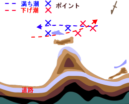 水深もあり満潮・干潮どの潮でも可能で狙い目は足下の岩の際で奥に下がり釣る |