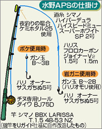 状況によって変わってくるので、上記はあくまで一例として考えて下さい。 それぞれの材料の特性について、次のページを目安にして下さい。 竿とリールは? 竿は5mか5.3mの1号前後、リールは2〜2.5号の道糸が